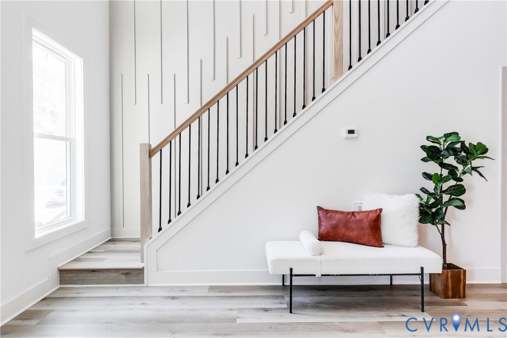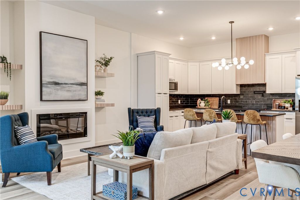 From the moment you enter, the dramatic foyer sets the tone-anchored by a breathtaking cascading light fixture that draws the eye upward and accentuates the home's soaring ceiling heights. An attractive accent wall along the staircase adds architectural interest and a refined design element, while open, airy spaces unfold effortlessly, filled with natural light and complemented by curated statement lighting throughout. The main level offers a seamless flow designed for both sophisticated entertaining and comfortable everyday living. The kitchen features stone countertops, light cabinetry, and a striking slate grey backsplash that creates a beautiful contrast. An inviting eat-at bar keeps the space connected and functional. The sitting area/living room showcases a sleek fireplace framed by modern shelving, offering a warm yet contemporary focal point. A dedicated first-floor office provides the perfect work-from-home retreat, along with a stylish powder room for guests. Upstairs, a generous loft with its own fireplace offers flexible living space-ideal as a secondary lounge or media room. The primary suite, privately situated at the rear of the home, opens to a balcony for quiet mornings or evening relaxation. The primary bath is equally impressive, featuring a large, beautifully tiled shower, double vanity, and elegant finishes that elevate the everyday. Two additional bedrooms and a well-appointed hall bath complete the second floor. For those ready to leave behind the maintenance demands of an older home and embrace the ease of newer construction-with the convenience of an attached garage and minimal yard work-this residence delivers exceptional city living. Ideally located near VCU and the energy of Downtown Richmond, 2120 Lamb Avenue offers style, simplicity, and sophistication in one exceptional address.